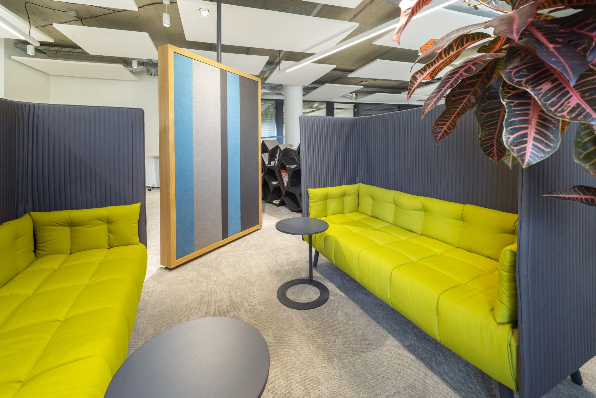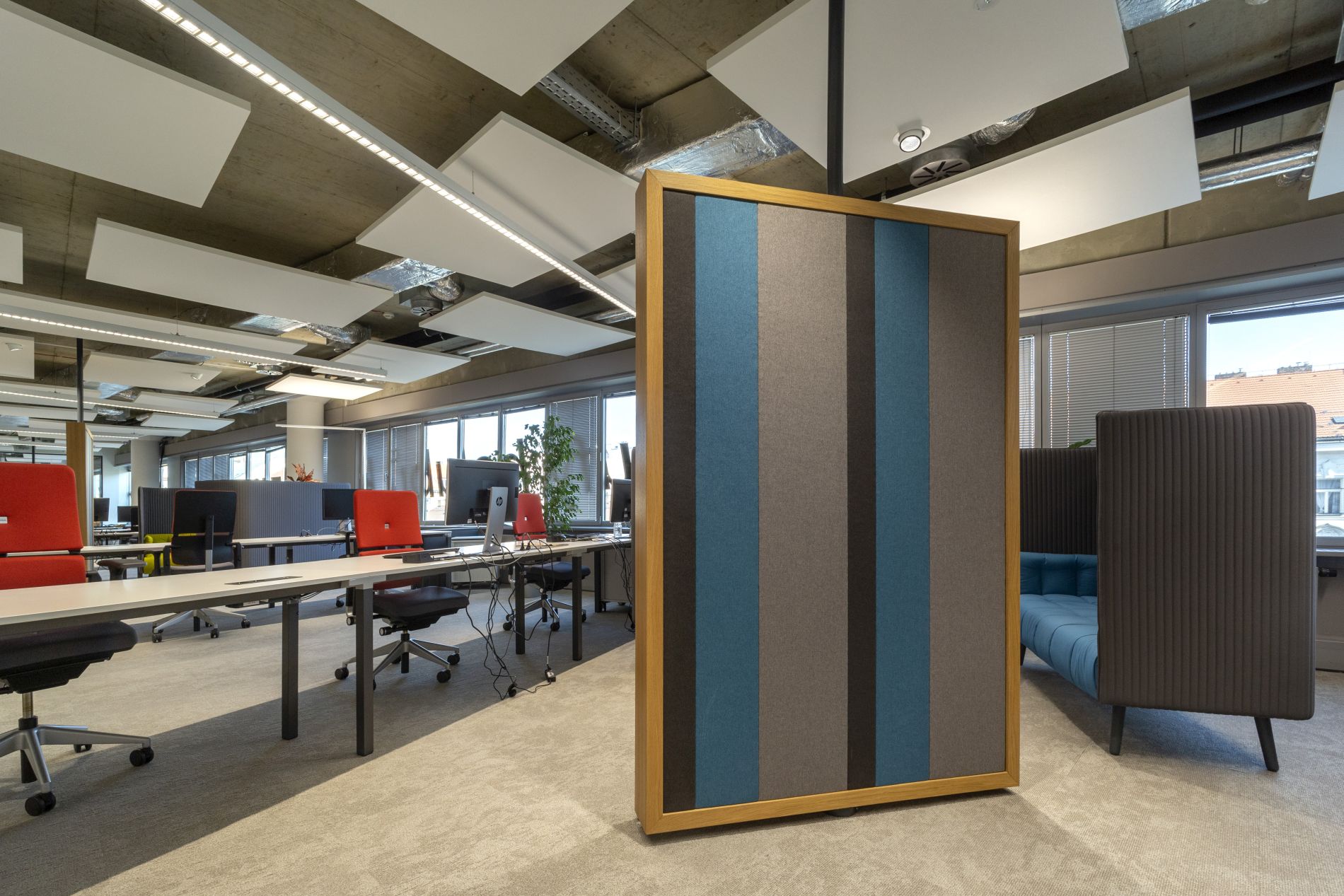 Otevřená halová kancelář doplněná zázemím a prostory pro relax v duchu firemní filosofie společnosti EON. Kombinace korporátního designu a originálních prvků ve spolupráci s grafickým studiem Upsala graphic design.